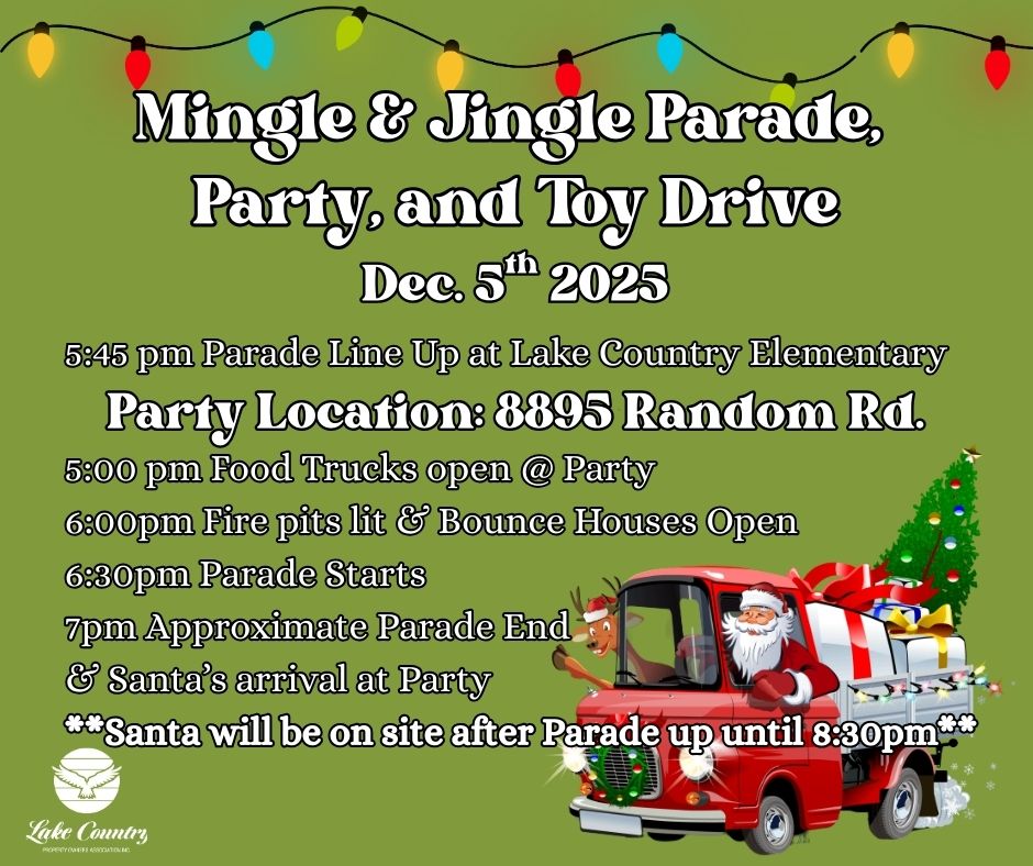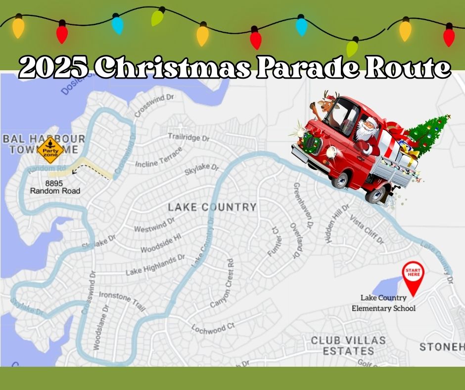 The Lake Country Independence Day Parade will wind its way through the streets of Lake Country Estates starting at the Lake Country Christian School parking lot (by LCCS blue roof tops) down to LCPOA Waterfront Park and Boat Launch.