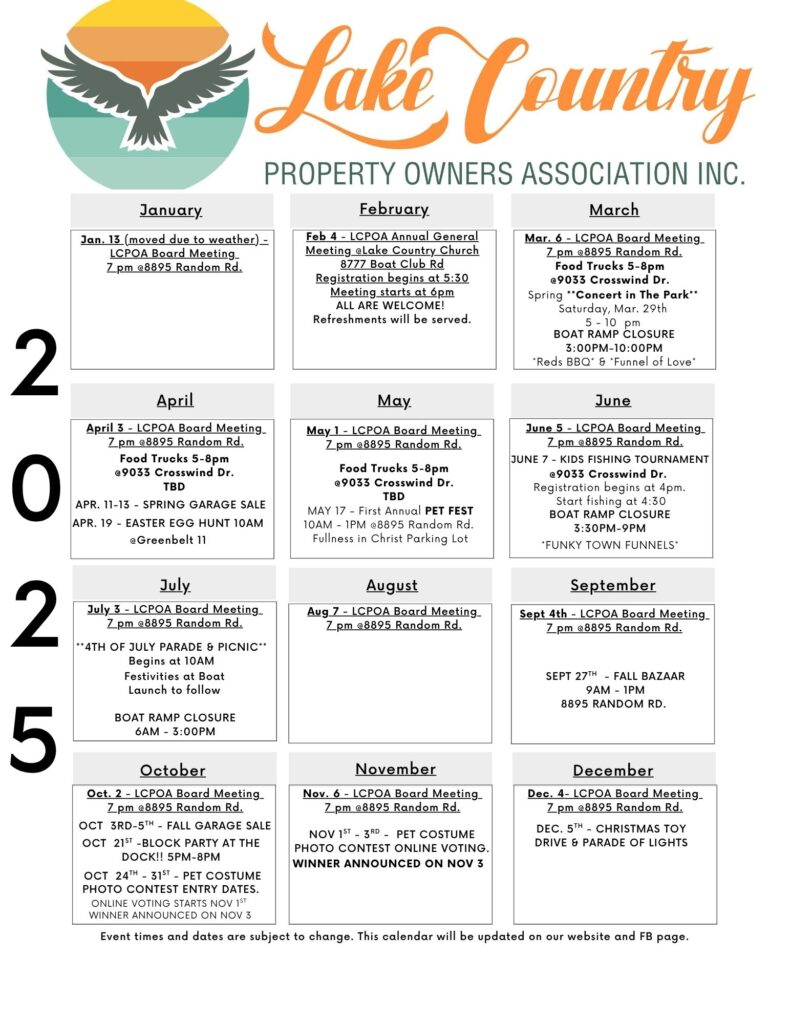 Your LCPOA Board of Directors is monitoring the Coronavirus (COVID-19) status closely to ensure all of our events are safe for our wonderful members and visitors. Unfortunately due to CDC, State and Local guidelines and executive orders – the Events Committee has had to cancel many previous events to remain compliant. As of Thursday June 4th, the Board of Directors decided that we would be having the Annual LCPOA Independence Day Parade but will not be able to have the picnic at the end due to social distancing requirements. We are hoping to be able to continue to ease restrictions throughout the end of the year as Local Authorities continue to allow for more changes.