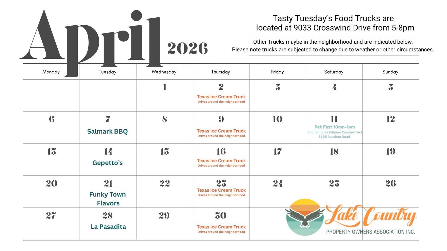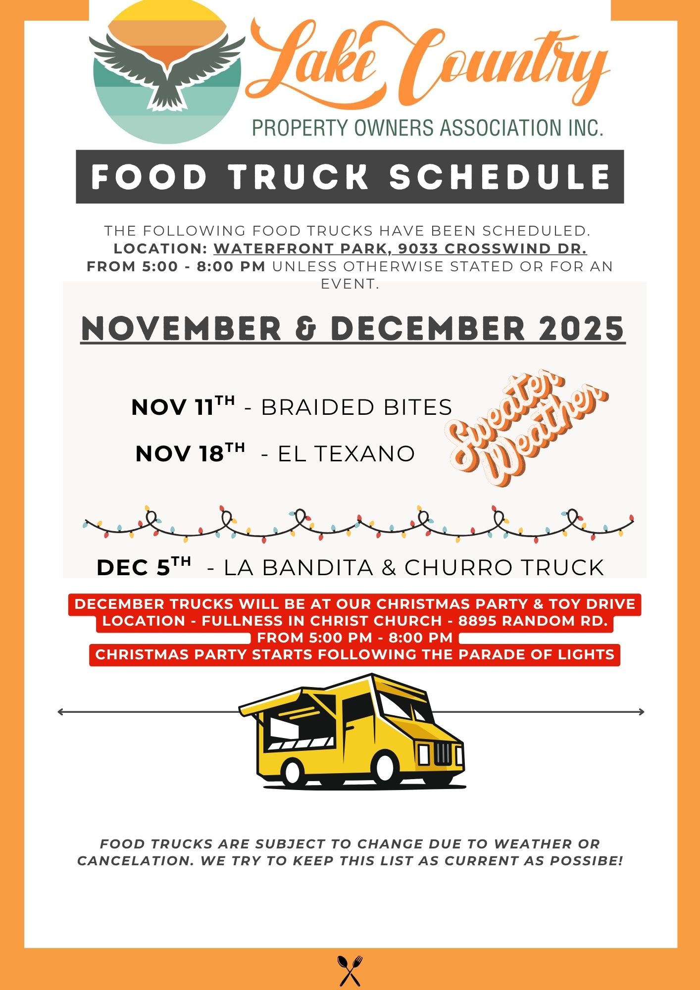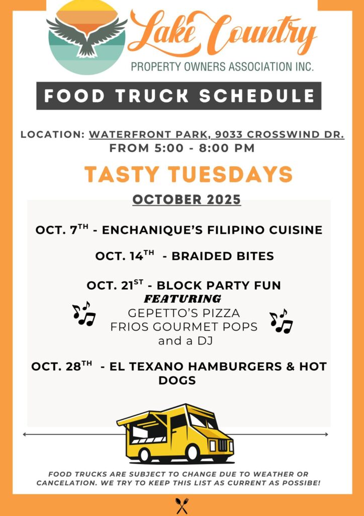 It’s Food Truck season!!! This is the line up through September. Our Events Committee is working on scheduling more so keep an eye out for the full list. Trucks will be located at Waterfront Park, 9033 Crosswind Dr from 5-8 PM