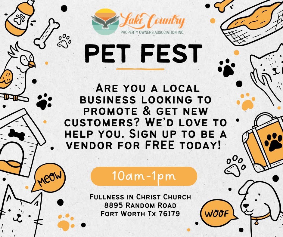 Next Saturday, April 11th, from 10am-1pm, LCPOA will be hosting our 2nd Annual Pet Fest and would love to have businesses, big and small. We would love to help support you and your business! We’d love to have you as a vendor; you don’t need a pet-related business to be part of this fest. The best part is this vendor fair is FREE!!!!